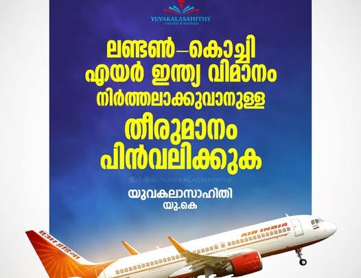 ലണ്ടൻ-കൊച്ചി വിമാന സർവീസ് നിലനിർത്തണം യുവകലാസാഹിതി യു.കെ
