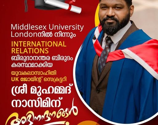 Middlesex University, London നിൽ നിന്നും International Relations ബിരുദാനന്തര ബിരുദം കരസ്ഥമാക്കിയ യുവകലാസാഹിതി ജോയിന്റ് സെക്രട്ടറി ശ്രീ മുഹമ്മദ് നാസിമിന് അഭിനന്ദനങ്ങൾ